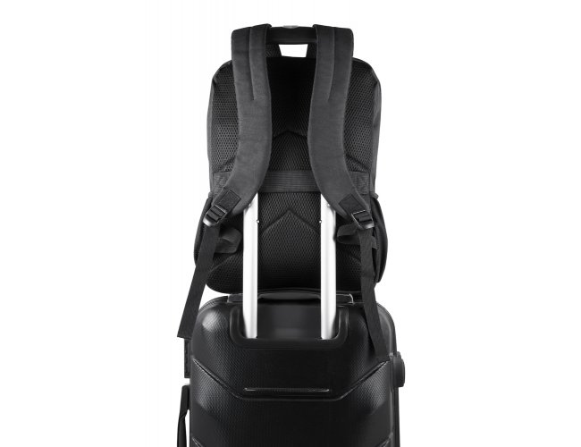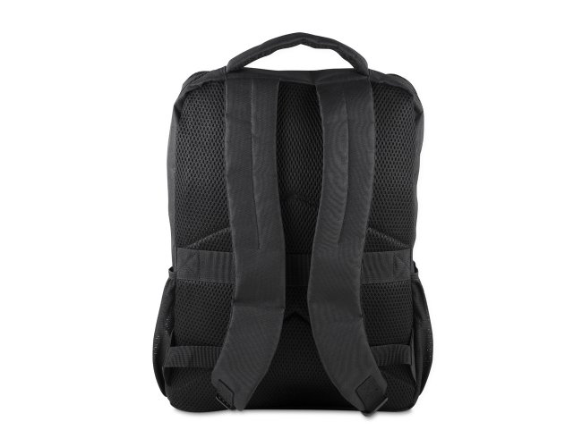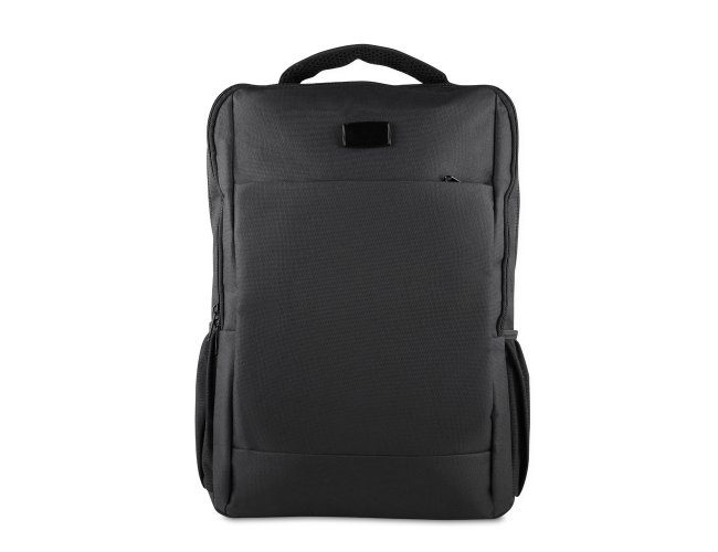 Mochila Personalizada em poliéster 600D com interior em poliéster 210D e capacidade de 13L. Possui plaquinha metálica imantada (2,2x4,1 AxL) na parte frontal da mochila, bolso frontal com zíper, dois bolsos laterais, engate para mala de viagem e dois compartimentos com divisórias, incluindo espaço para notebook de até 15,6”.